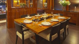 The lower deck includes two generous double VIP cabins and two twin cabins, all offering en-suite facilities and individual entertainment systems.